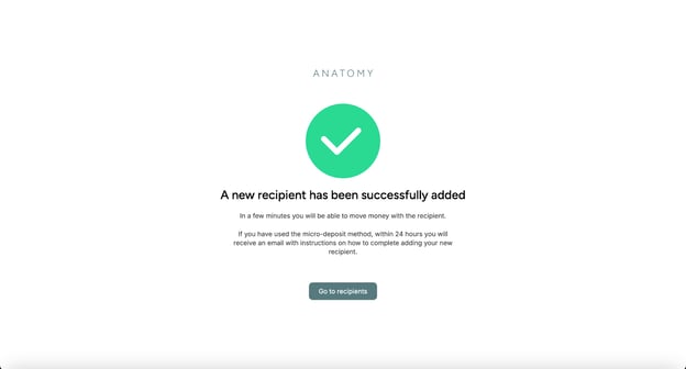 5. Find your institution and log in. From there, Plaid will walk you through the linking process. You've successfully completed the process if you're redirected to the Anatomy platform and see a success message with your external account on the Recipients page. The platform may ask you to "Complete verification" by uploading a bank statement from the last 60 days.