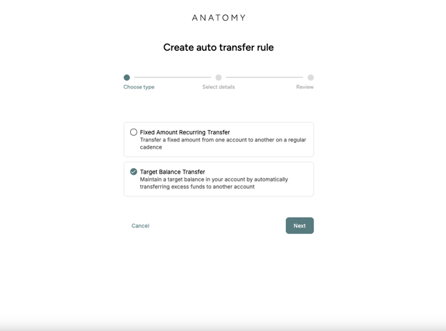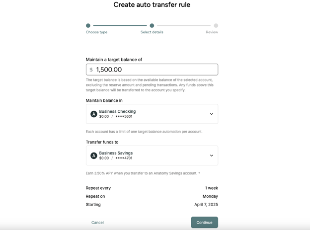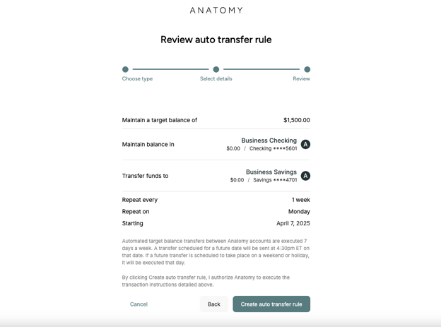 You can set up a transfer rule that will automatically move your excess funds into your external bank account or another Anatomy account (e.g., savings account) on a weekly basis to maintain a target balance.